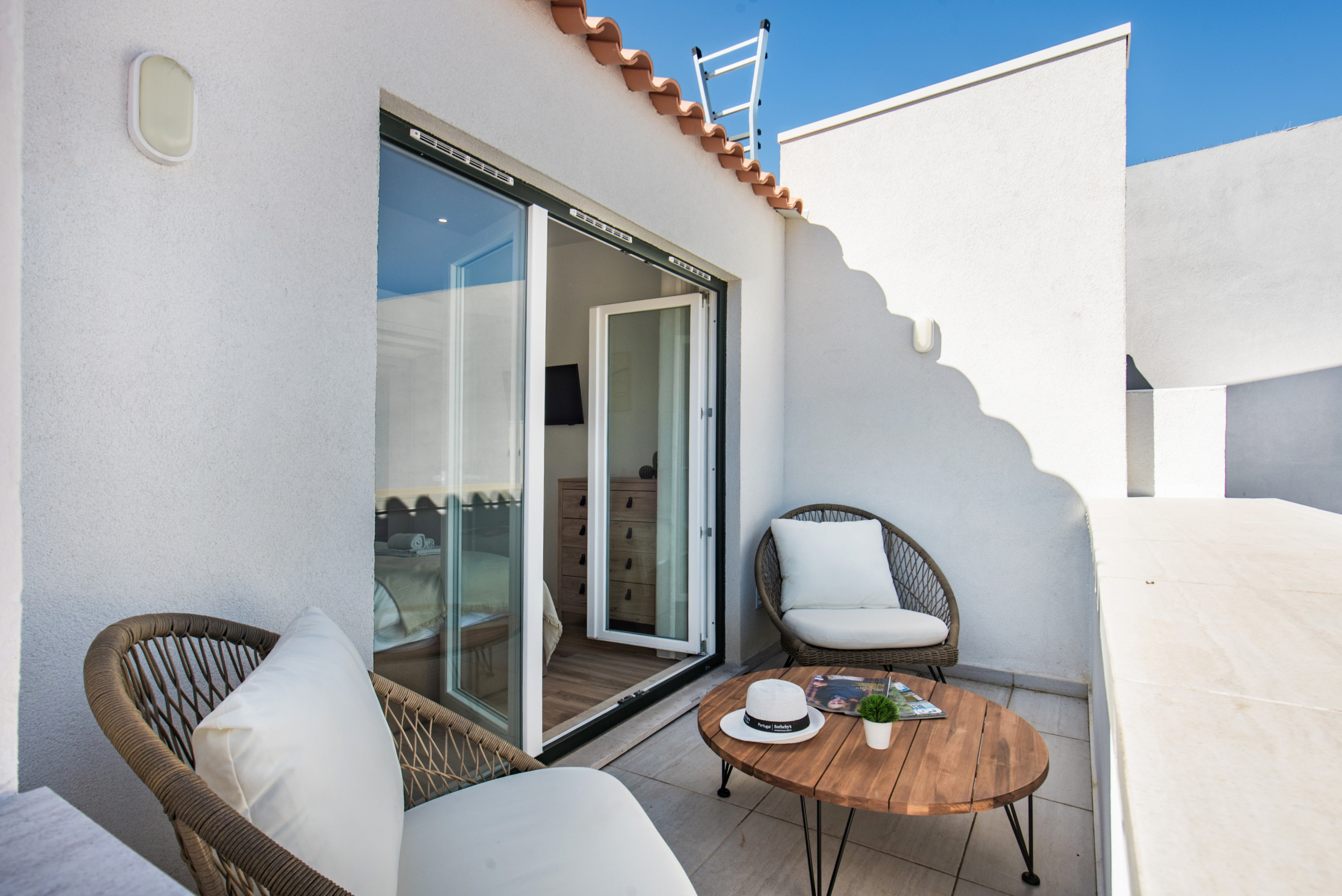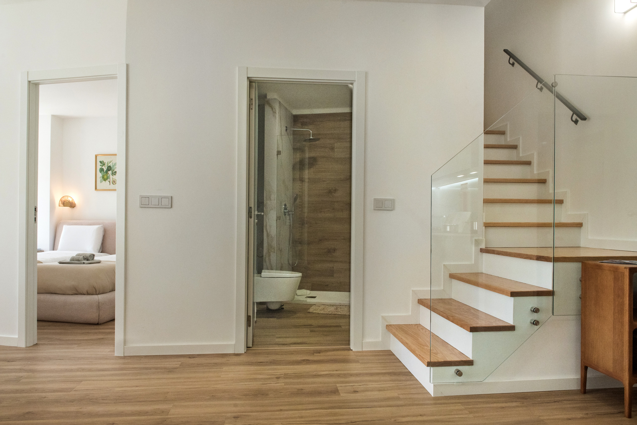 This duplex apartment features a modern, elegant decoration and excellent natural lighting. On the lower floor, you will find the living room with a dining area with a dining table, a fully equipped kitchen and a small laundry area, as well as a bedroom with two single beds and a bathroom. On the upper floor, accessible by interior stairs, is the main bedroom with a double bed and a private bathroom. This floor also has a spacious relaxation area with a desk, ideal for reading, remote work or moments of rest. From the bedroom, there is access to a small terrace on the upper floor, a pleasant space to get some fresh air and enjoy a moment outdoors. The accommodation also has a television with international channels, high-speed internet and air conditioning in all rooms, ensuring comfort throughout the year.