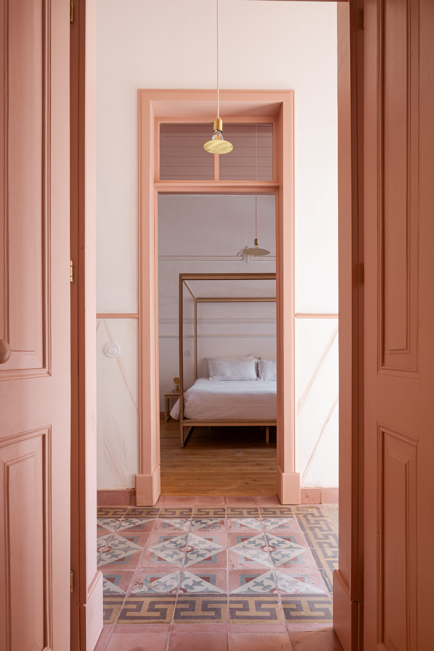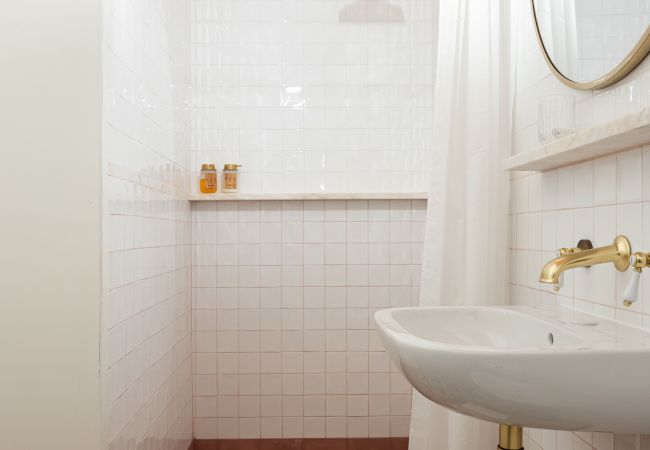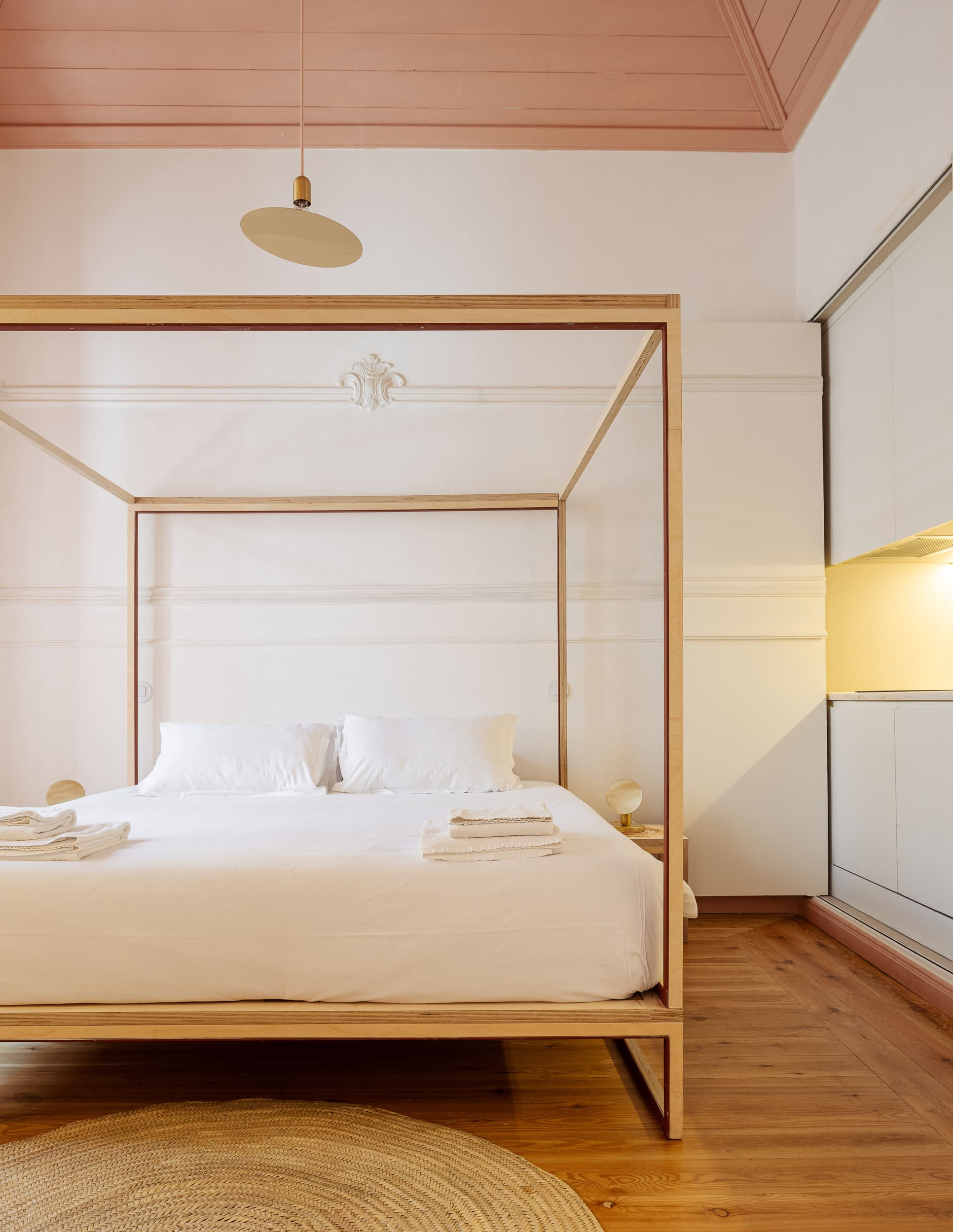 This T0 was carefully integrated into the ground floor of the house, where the bourgeois heritage of the 1920s intersects with a contemporary and understated design. The studio is fully equipped with a functional kitchenette, comfortable double bed and private bathroom. The decoration respects the original layout, with wooden details, decorative cornices and old rose accents that provide sophistication and serenity to the environment. The wooden ceiling, worked in a pyramidal shape and painted in old rose, adds a unique touch of architectural elegance to the space. It includes television with international channels, high-speed internet and welcoming lighting, designed to create an ideal space to rest and enjoy your stay.